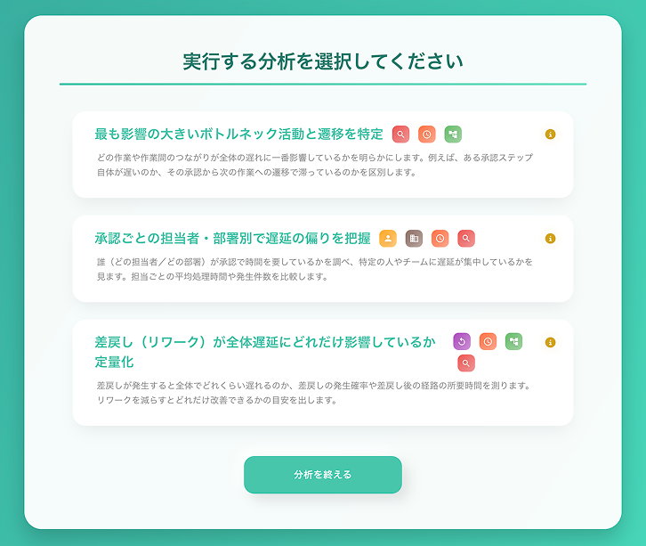 利用者が「時間のかかっている業務を特定したい」といった目的を日本語で入力すると、AIがデータを解釈し、「最も影響の大きいボトルネック活動を特定する」といった具体的な分析ステップを3択で提案します。