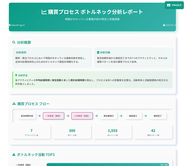 『Optpath Agent』では、AIが膨大なデータの中からボトルネックや非効率なパターンを自動で「発見」し、改善すべきポイントを具体的に提示します。